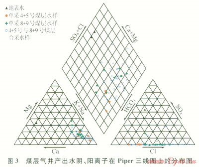 如圖3所示,不同地區(qū)煤層氣井產(chǎn)出水陰、陽(yáng)離子在Piper三線(xiàn)圖上的分布較離散。北部地區(qū)煤層氣井產(chǎn)出水以K+、Na+、Cl-和HCO3-為主,Ca2+、Mg2+含量較低,SO42-含量極少,與地表水離子組成差異較大,說(shuō)明該區(qū)遠(yuǎn)離補(bǔ)給區(qū);而東南部地區(qū)煤層氣井產(chǎn)出水K+、Na+、Cl-含量較北部低,Ca2+、Mg2+含量略高于北部地區(qū)、SO42+含量較北部地區(qū)高,與地表水相似程度較高,說(shuō)明該區(qū)靠近補(bǔ)給區(qū)。另外,該區(qū)產(chǎn)出水呈弱堿性,pH值介于7.1~8.3,平均值為7.8,不同地區(qū)差異較小。