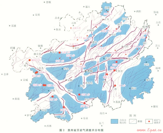 為改善能源結(jié)構(gòu),改變貴州省“無(wú)油少氣”的局面,貴州省人民政府于2012年3月開展了貴州省頁(yè)巖氣資源調(diào)查評(píng)價(jià)項(xiàng)目,針對(duì)貴州省黑色頁(yè)巖目的層,施工了27口調(diào)查井(圖2)。本文的主要數(shù)據(jù)即來(lái)源于《貴州省頁(yè)巖氣資源調(diào)查評(píng)價(jià)報(bào)告》,所公布的數(shù)據(jù)為將國(guó)內(nèi)有資質(zhì)的測(cè)試單位與國(guó)外測(cè)試機(jī)構(gòu)提供的數(shù)據(jù)比較修正后的結(jié)果。