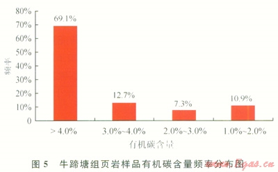 牛蹄塘組干酪根有機(jī)顯微組分以腐泥無(wú)定型和腐殖無(wú)定型為主,前者相對(duì)豐度為11%~92%,平均為49%;后者相對(duì)豐度為8%~85%,平均為48%。干酪根類型指數(shù)為51~96,干酪根類型以腐泥型和偏腐泥混合型為主。綜合分析認(rèn)為:貴州省牛蹄塘組含氣頁(yè)巖的母源主要為藻類等低等水生生物,生烴能力較強(qiáng)。通過(guò)對(duì)牛蹄塘組地表露頭和鉆孔巖心樣品的有機(jī)碳含量測(cè)試,發(fā)現(xiàn)頁(yè)巖有機(jī)碳含量范圍為0.7%~14.6%,平均為5.2%,主頻在大于4.0%的區(qū)間(圖5)。