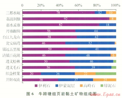 該區(qū)牛蹄塘組頁(yè)巖石英、長(zhǎng)石等碎屑礦物含量為24%~88%,平均為72.3%;自生脆性礦物含量為0~62%,平均為8.6%;黏土礦物含量介于l2%~30%,平均為19.0%。黏土礦物以伊利石和伊蒙混層為主,綠泥石較少見(圖6)。巖石礦物學(xué)特征表明:頁(yè)巖儲(chǔ)層脆性礦物總體含量高,具有較好的破裂潛力,預(yù)測(cè)開發(fā)過(guò)程中可取得較好的儲(chǔ)層改造效果[12]。