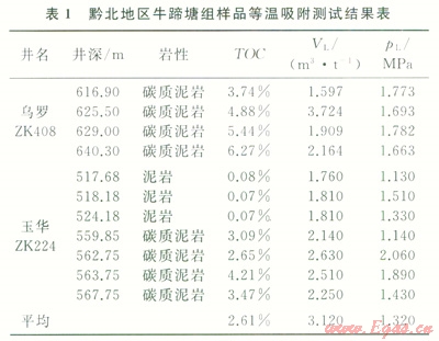 從表l可見,3件樣品有機(jī)碳含量小于1.5%,平均蘭氏體積(VL)為1.79m3/t,平均蘭氏壓力(pL)為1.32MPa;10件樣品有機(jī)碳含量大于1.5%,平均VL為3.12m3/t,平均pL為l.34MPa。綜合上述測(cè)試結(jié)果,牛蹄塘組頁(yè)巖模擬最大吸附能力平均為3.12m3/t。