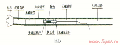本次采用有線控向系統(tǒng),井下鉆具組合主要由鉆頭、帶彎外殼的螺桿馬達、泥漿壓力傳感器、控向探棒(兩端帶扶正器)和無磁鉆鋌組成,其中控向探棒安裝在無磁鉆鋌內(nèi)部。如圖3:
