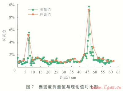 在同一根連續(xù)油管上50mm處和470mm處預(yù)制5.1%和9.2%的2個橢圓度缺陷。實驗過程中,每隔30mm選取一點用游標卡尺逐點測量橢圓度作為理論值。