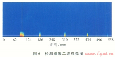 實驗過程中,連續(xù)油管以1m/s的速度(實際作業(yè)時的速度)在機械裝置中抽動。圖5是某通道原始磁信號曲線,可以看出分別在95mm、185mm、298mm、421mm、525mm處出現(xiàn)了向上(因為用線切割預(yù)制的缺陷類似裂紋、腐蝕缺陷)的磁信號異常,這就是工件上所預(yù)制的5個人工缺陷。圖6檢測結(jié)果二維成像圖更加明顯,直觀表示了這些缺陷和大小。圖4表明了5個缺陷在油管上準確位置分別是l02mm、191mm、295mm、424mm、527mm,這與實際檢測的位置相比最大絕對誤差為7mm(第1個缺陷),相對誤差不到1%。