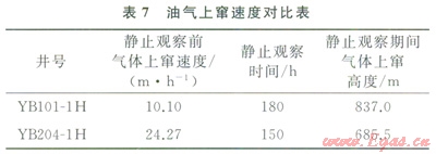元壩氣田在YB101-1H、YB204-1H井投產(chǎn)中進(jìn)行了試驗(yàn),在YB101-1H靜止觀察前測得氣體上竄速度為10.1m/h,靜止觀察180h后,氣體上移距離837m;在YB204-1H井中靜止觀察前測得氣體上竄速度為24.27m/h,靜止觀察150h后,氣體上移距離685.5m,氣體上竄速度均沒有明顯增加,驗(yàn)證了氣體在壓井液中的運(yùn)行規(guī)律(表7)。實(shí)踐證明,通過短起下測油氣上竄速度能夠滿足下完井投產(chǎn)管柱的井控需要。