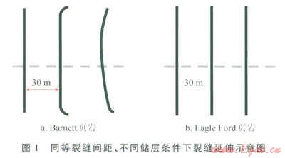 隨著工具設(shè)備及水平井改造技術(shù)的不斷進(jìn)步,儲(chǔ)層多段改造的規(guī)模、段數(shù)等越來越多[8-9]。水力壓裂沒計(jì)師可利用分簇射孔將分段改造距離設(shè)置得越來越近,但往往過多的分簇與分段未必就帶來理想的效果,Roussel認(rèn)為應(yīng)力陰影效應(yīng)的產(chǎn)生機(jī)理主要在于支撐劑的填充導(dǎo)致人工裂縫附近引起了應(yīng)力場(chǎng)的變化,蔣廷學(xué)等也在研究我國頁巖氣壓裂設(shè)計(jì)中指出,壓裂在單一裂縫脆弱面上產(chǎn)生誘導(dǎo)應(yīng)力的存在,并指出產(chǎn)生應(yīng)力陰影的誘導(dǎo)應(yīng)力可以改變最大與最小主應(yīng)力的分布,使裂縫發(fā)生轉(zhuǎn)向[10]。述研究表明,應(yīng)力陰影效應(yīng)可引起人工裂縫從水平井的橫切縫中開始偏離朝向或遠(yuǎn)離以前的裂縫方向延伸,使得下一裂縫發(fā)生轉(zhuǎn)向。Barnctt頁巖裂縫間距30m時(shí)水平井壓裂裂縫產(chǎn)生的應(yīng)力陰影效應(yīng)如圖1-a所示,可見從第二條裂縫開始裂縫出現(xiàn)了與主縫向切的裂縫系統(tǒng),而Eagle Ford頁巖壓裂的裂縫監(jiān)測(cè)情況,同樣是30m的裂縫間距沒有出現(xiàn)裂縫應(yīng)力陰影效應(yīng)(圖1-b)。因此研究陰影效應(yīng)的產(chǎn)生機(jī)理,建立分析數(shù)學(xué)模型并進(jìn)行其影響因素分析對(duì)水平井分段體積改造優(yōu)化設(shè)計(jì)及效果的提升具有重要研究與應(yīng)用價(jià)值。