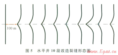 以某口致密儲(chǔ)層X水平井為例,水平段長度1043m,儲(chǔ)層有效孔隙度8%,有效滲透率0.12mD,地層孔隙壓力29.0MPa,楊氏模量25000MPa,泊松比0.2,最小水平主應(yīng)力43.2 MPa,抗張強(qiáng)度3.5MPa。分段改造設(shè)計(jì)6~10段。利用上述數(shù)學(xué)模型計(jì)算水平井10段改造下不同段內(nèi)的凈壓力及裂縫形態(tài)表明:100m的段間距內(nèi)裂縫將發(fā)牛轉(zhuǎn)向(圖4、5)。