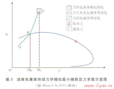 目前古流體壓力值測(cè)定方法有多種[8-18],筆者結(jié)合本地區(qū)油氣成藏的地質(zhì)條件,采用流體包裹體PVT模擬法來(lái)計(jì)算古流體壓力值。如圖3中,ABC線(xiàn)為烴類(lèi)包裹體或含烴鹽水包裹體等容線(xiàn),AB段為氣液兩相共存,到B點(diǎn)均一為液相;ThB為含烴鹽水或烴類(lèi)流體包裹體均一溫度,ThC為同期鹽水包裹體均一溫度。