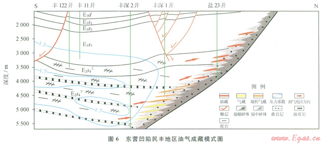 早期生烴作用與油氣充注形成超壓是陸相斷陷盆地油氣成藏的另一種類(lèi)型,其條件是毗鄰斷陷深洼的陡坡帶、發(fā)育巨厚的近岸水下扇砂礫巖體和短距離的油氣運(yùn)聚(圖6)。