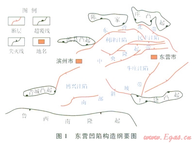東營(yíng)凹陷是隸屬于渤海灣盆地濟(jì)陽(yáng)坳陷的次一級(jí)負(fù)向構(gòu)造單元,屬于新生代形成的斷陷盆地,呈典型的北斷南超構(gòu)造格局,北部為陡坡構(gòu)造帶(又稱(chēng)東營(yíng)北帶),中部為洼陷帶和中央隆起帶,南部為緩坡構(gòu)造帶(圖1)。
