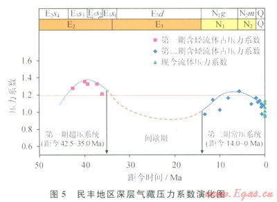 民豐地區(qū)深層氣藏(包括凝析氣藏)古壓力系數(shù)隨時(shí)間演化的關(guān)系表明(圖5):