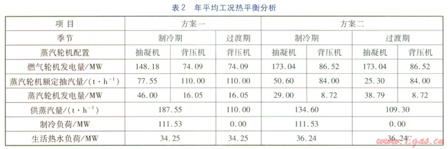 兩種裝機方案的機組年平均工況熱平衡分析見表2。由表2可知,兩種方案在制冷期和過渡期均能滿足負荷需求。兩種裝機方案的全廠熱經(jīng)濟性指標見表3。