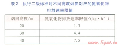 根據(jù)GB 3095—1996《環(huán)境空氣質(zhì)量標(biāo)準(zhǔn)》規(guī)定,該項(xiàng)目所在地為二類區(qū)(城鎮(zhèn)規(guī)劃中確定的居住區(qū)、商業(yè)交通居民混合區(qū)、文化區(qū)、一般工業(yè)區(qū)和農(nóng)村地區(qū)),應(yīng)執(zhí)行二級標(biāo)準(zhǔn)。根據(jù)GB 16297—1996規(guī)定,執(zhí)行二級標(biāo)準(zhǔn)時(shí)不同高度煙囪對應(yīng)的氮氧化物排放速率限值見表2。
