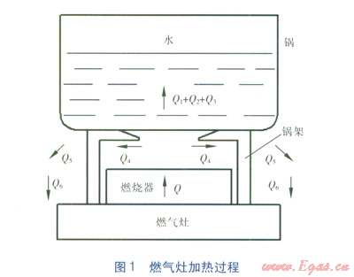 家用燃?xì)庠顭嵝适窃跇?biāo)準(zhǔn)試驗(yàn)條件下,有效利用的熱量在燃?xì)馊紵尫趴偀崃恐兴嫉谋壤慈細(xì)饽茉吹睦寐?,是衡量家用燃?xì)庠钍欠窆?jié)能的關(guān)鍵指標(biāo)。我們以GB16410—2007《家用燃?xì)庠罹摺芬?guī)定的標(biāo)準(zhǔn)試驗(yàn)條件下的燃?xì)庠詈驮囼?yàn)用鍋?zhàn)鳛檠芯繉?duì)象,分析燃?xì)庠畹募訜徇^程(見圖1)。