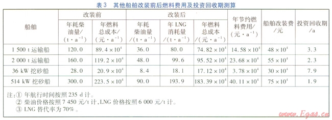 對于柴油—LNC雙燃料船舶,LNG替代約70%的燃油時(LNG替代率為70%)發(fā)動機運行穩(wěn)定,即LNG與柴油使用比例(質(zhì)量比)約為7:3。根據(jù)柴油—LNG雙燃料船舶運行經(jīng)驗數(shù)據(jù)可知,船舶油改氣后預(yù)計能節(jié)約16%~20%的燃料成本,運營企業(yè)的贏利能力將因此大大增強。
