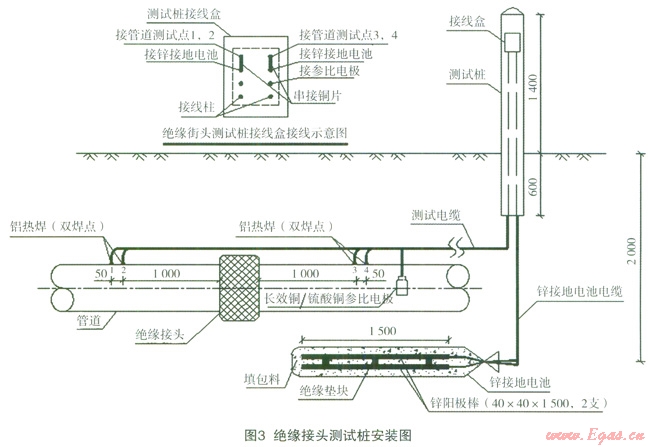 工藝專(zhuān)業(yè)一般都在加氣站、門(mén)站、調(diào)壓站等場(chǎng)站的進(jìn)出站管道上設(shè)有絕緣接頭。絕緣接頭的功能主要有兩個(gè),一是將陰極保護(hù)電流限制在站外管道上,防止陰極保護(hù)電流通過(guò)站內(nèi)工藝裝置的接地系統(tǒng)流失,二是將站內(nèi)設(shè)備的雜散電流隔絕在站內(nèi),防止雜散電流流到站外長(zhǎng)輸管道或者城市管網(wǎng)上造成雜散電流干擾腐蝕。但絕緣接頭只能作為隔絕管道陰極保護(hù)電流及站內(nèi)雜散電流用,而不能作為過(guò)電壓的安全防護(hù)措施用,站內(nèi)及管道上因雷擊產(chǎn)生的高電壓、站內(nèi)設(shè)備故障產(chǎn)生的高電壓、管道上因氣流摩擦而產(chǎn)生的靜電、長(zhǎng)輸管道的感應(yīng)過(guò)電壓等都會(huì)將絕緣接頭損壞。絕緣接頭一旦損壞就會(huì)對(duì)長(zhǎng)輸管道或者城市管網(wǎng)的陰極保護(hù)系統(tǒng)造成嚴(yán)重影響,甚至使陰極保護(hù)系統(tǒng)失效,所以必須為絕緣接頭添加防護(hù)措施。絕緣接頭的防護(hù)裝置主要有避雷器、電解接地電池、極化電池及二極管保護(hù)器,目前應(yīng)用最廣泛的是接地電池。接地電池是用來(lái)提供一個(gè)低電阻通道,排放強(qiáng)電電涌但不泄漏陰極保護(hù)直流電流的一種裝置,通常采用鋅材料制作[1]。