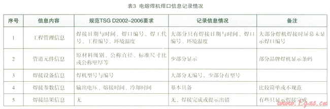 在焊口信息記錄方面,各品牌電熔焊機(jī)都具有數(shù)據(jù)檢索存儲(chǔ)功能,配置相應(yīng)的輸出接口(數(shù)據(jù)下載或打印接口),存儲(chǔ)容量高于標(biāo)準(zhǔn)和規(guī)范要求(不少于250個(gè))。但是,與全自動(dòng)熱熔焊機(jī)一樣存在信息不規(guī)范或不全的問題。對(duì)于具有可追溯性的焊口信息來說,應(yīng)至少包括工程管理、管道元件信息、焊接設(shè)備信息、焊接參數(shù)信息和焊接結(jié)果信息等5個(gè)方面。如表3所示,不少焊機(jī)記錄的焊口信息過于簡單和不規(guī)范。這既與目前相關(guān)標(biāo)準(zhǔn)和規(guī)范對(duì)此要求不夠具體有關(guān),又與對(duì)焊口信息對(duì)焊接工程管理重要性認(rèn)識(shí)不足有關(guān)。