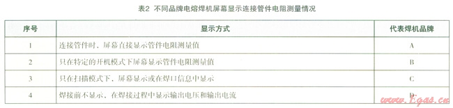 其二,各品牌焊機(jī)對(duì)連接管件電阻測量功能存在明顯的差異。一方面,表2匯總了常見品牌焊機(jī)焊接前屏幕顯示連接管件電阻測量值的情況??梢钥闯觯许纹放坪笝C(jī)在焊接前不顯示或不直接顯示,這是不滿足國家標(biāo)準(zhǔn)的要求。另一方面,當(dāng)電熔管件電阻值較小時(shí),大部分電熔焊機(jī)的電阻測量偏差超出標(biāo)準(zhǔn)規(guī)定的測量偏差允許范同。檢測中發(fā)現(xiàn),某個(gè)焊機(jī)在連接2W管件時(shí),焊接前屏幕顯示測量電阻值為60W。這既與焊機(jī)的電阻測量精度有關(guān),又與連接接頭的接觸電阻有關(guān)。