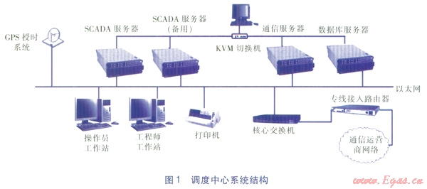 調度中心是整個SCADA系統(tǒng)的調度指揮中心,操作人員在調度指揮中心通過計算機系統(tǒng)即可完成對整個城市燃氣輸配管網(wǎng)的監(jiān)控和運行管理等任務。調度指揮中心配置SCADA服務器、通信服務器、數(shù)據(jù)庫服務器、專線接入路由器、核心交換機、操作員工作站、工程師工作站等設備,并通過局域網(wǎng)相連,系統(tǒng)結構見圖1。