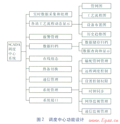 調度中心接收現(xiàn)場監(jiān)控站點PLC采集的數(shù)據(jù),主要完成燃氣廠站的實時數(shù)據(jù)采集和處理、各站工藝流程的動態(tài)顯示、報警管理、數(shù)據(jù)歸檔、在線組態(tài)、熱備切換、通信管理、系統(tǒng)管理以及設置、記錄、報表生成及打印等輔助功能,如圖2所示。通過彩色顯示器可直觀地顯示全站各工藝流程段的實時工況、各工藝參數(shù)的趨勢畫面,使操作人員及時掌握全站運行情況,以實現(xiàn)整個燃氣管網(wǎng)的優(yōu)化、經(jīng)濟、合理、可靠地運行。