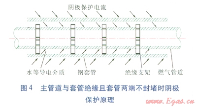 ③不可避免加設(shè)套管時,套管兩端可不必密封防水材料,只要在主管道與套管之間充填柔軟材料防止沙石進(jìn)入對防腐層起破壞作用即可。因?yàn)楫?dāng)套管內(nèi)有水或泥土存在時,能起到導(dǎo)電介質(zhì)的作用,陰極保護(hù)電流通過介質(zhì)形成回路,不會被屏蔽。套管可視為土壤介質(zhì)的一部分,陰極保護(hù)電流從套管外壁流入,從套管內(nèi)壁流出,再從主管道外部流入,主管道將受到很好的陰極保護(hù)[2]。如果套管與主管道間有特定性能的電解質(zhì)物質(zhì),導(dǎo)電性能會更好,主管道陰極保護(hù)的效果會更好,其原理見圖4。