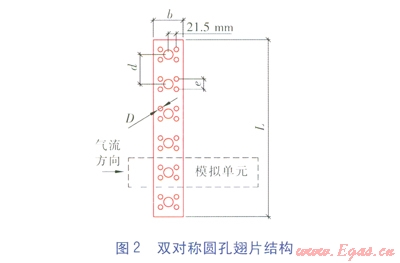 研究對象選取單排換熱管的矩形平翅片管換熱器、雙對稱圓孔翅片管換熱器,幾何尺寸按照文獻[7]中實驗樣件的尺寸確定,基本尺寸:換熱管外徑Do為25mm,翅片厚度d為0.5mm,換熱管間距d為76mm,翅片間距s為10mm,翅片寬度b為6lmm,翅片長度L為296mm,圓孔間距e為26mm,圓孔直徑D為14mm。兩種翅片管換熱器的翅片數(shù)均為28片,矩形平翅片管換熱器總換熱面積為1.1139m2,雙對稱圓孔翅片管換熱器總換熱面積為1.1089m2。由于翅片管換熱器所有翅片幾何結構相同,為了簡化研究,取單個翅片作為研究對象,根據(jù)對稱特性,取其中的一個區(qū)域作為模擬單元進行研究。矩形平翅片、雙對稱圓孔翅片結構分別見圖1、2。