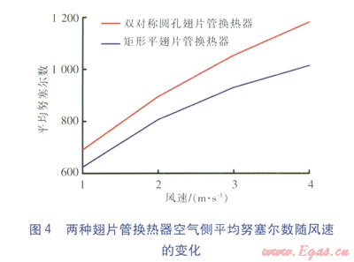 兩種翅片管換熱器空氣側平均努塞爾數(shù)隨風速的變化見圖4。由圖4可知,隨著風速的增大,兩種翅片管換熱器空氣側平均努塞爾數(shù)均明顯增大,且相同風速下雙對稱圓孔翅片管換熱器空氣側平均努塞爾數(shù)明顯高于矩形平翅片管換熱器。