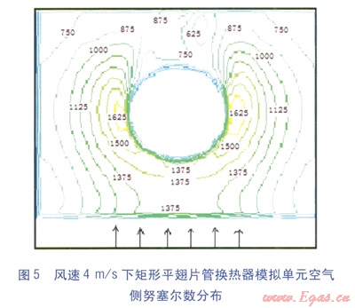 風速4m/s下兩種模擬單元空氣側努塞爾數(shù)分布見圖5、6。由圖5、6可知,矩形平翅片管換熱器模擬單元空氣側努塞爾數(shù)的最大值出現(xiàn)在換熱管的兩側,雙對稱圓孔翅片管換熱器模擬單元的最大值出現(xiàn)在流動的起始位置;最小值均出現(xiàn)在換熱管后尾流區(qū)。在相近位置上,雙對稱圓孔翅片管換熱器模擬單元空氣側努塞爾數(shù)明顯高于矩形平翅片管換熱器模擬單元,這說明前者的傳熱性能優(yōu)于后者。