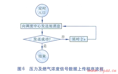 系統(tǒng)會(huì)將定時(shí)采集到的壓力及燃?xì)鉂舛刃盘?hào)數(shù)據(jù),以短信形式定時(shí)向調(diào)度中心接收端GSM模塊發(fā)送,詳見(jiàn)圖6。