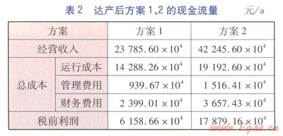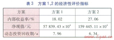 本文采用內部收益率(稅前)、凈現(xiàn)值(稅前)、動態(tài)投資回收期(稅前)作為方案經濟性評價指標。內部收益率的經濟含義是項目在其壽命期內未回收資金的預計收益率,項目投入運營后,投資額將通過每年所產生凈效益的形式逐步得到回收。已回收部分將用于再投資,未回收部分待繼續(xù)回收,內部收益率就是指未回收部分的收益率,因此稱為內部收益率。凈現(xiàn)值的經濟含義是項目在其壽命期內預計創(chuàng)造的全部凈效益。內部收益率、凈現(xiàn)值都是反映項目贏利能力的指標,前者體現(xiàn)的是相對贏利能力,后者體現(xiàn)的是絕對贏利能力。內部收益率、凈現(xiàn)值越大,項目贏利能力越強。動態(tài)回收期越短,說明項目收回投資額的時間越短。方案1、2的經濟性評價指標見表3。由表3可知,方案2的內部收益率、凈現(xiàn)值均高于方案l,且方案2的動態(tài)投資回收期短于方案l,這說明方案2的經濟性優(yōu)于方案l。
