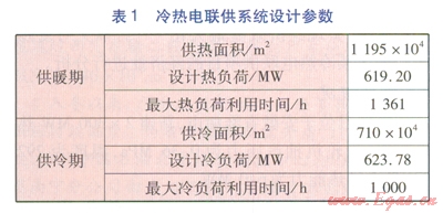 對于供冷對象,考慮到居住建筑同時利用率低、運行管理及收費復雜等情況,該冷熱電聯(lián)供系統(tǒng)的供冷對象主要考慮辦公、商場等公共建筑,不考慮居住建筑。供熱對象涉及居住建筑及公共建筑,居住建筑供熱面積為627×104m2,公共建筑供熱面積為568×104m2。冷熱電聯(lián)供系統(tǒng)設計參數見表l。由表1可知,該冷熱電聯(lián)供系統(tǒng)設計冷熱負荷比較接近,這對于熱電機組的高效運行十分有利。