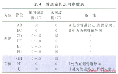 管道總長度約為780m,起點和終點分別設(shè)置固定墩l、2,用以截斷研究對象外管道對模型的影響。西側(cè)進土導(dǎo)向B前有30m長的管段,與入土處有30°的偏離;西側(cè)水平管段長約為110m,斜管總長約為215m;東側(cè)出土導(dǎo)向工后有30m長的管段,與出土處有30°的偏離;東側(cè)水平管段長為105m,斜管長約為290m。管道均采用大開挖的敷設(shè)方式,彎管的曲率半徑(R)6D(D為管道外徑),地區(qū)等級為l級,設(shè)計系數(shù)為0.72。管道為空間結(jié)構(gòu),在X、Y、Z方向上均有長度分量,其在XOY平面上的走向如圖2所示,具體空間參數(shù)如表4所示。
