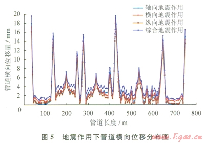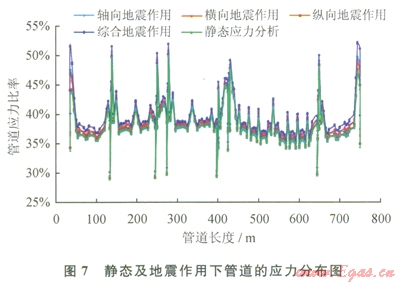 46為地震作用下管道軸向、橫向及縱向位移沿管長的分布情況,圖7為靜態(tài)及地震作用下應(yīng)力沿管長的分布情況,由圖47可以得出以下結(jié)論: