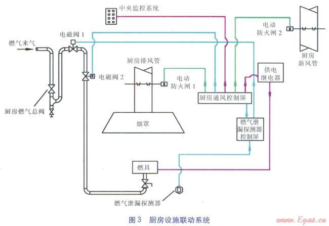 由于在商業(yè)廚房內(nèi)安裝燃?xì)庠O(shè)施種類及數(shù)量較多,需要防止燃?xì)庑孤瑫r(shí)在廚房火災(zāi)發(fā)生時(shí),若有燃?xì)庵紕t火災(zāi)更加難以控制,造成的災(zāi)難更大?;诎踩珳?zhǔn)則,工程實(shí)踐中,通常在商業(yè)廚房的燃?xì)饪傞y的下游設(shè)置一組電磁閥,與燃?xì)庑孤┨綔y器、廚房通風(fēng)管道內(nèi)的電動(dòng)防火閘、供電繼電器聯(lián)動(dòng)。當(dāng)燃?xì)庑孤┨綔y器偵測到泄漏發(fā)生時(shí),發(fā)出報(bào)警,電磁閥關(guān)閉、電動(dòng)防火閘關(guān)閉、供電繼電器切斷廚房燃具電源。由上述設(shè)備組成的廚房聯(lián)動(dòng)系統(tǒng)同時(shí)切斷了可燃物燃?xì)狻⒅嘉锟諝獾墓?yīng)以及消除可能存在的點(diǎn)火源。電動(dòng)防火閘的關(guān)閉則更是可以遏制火災(zāi)經(jīng)通風(fēng)管道向其他地方蔓延。廚房設(shè)施聯(lián)動(dòng)系統(tǒng)見圖3。