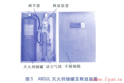 ②調(diào)節(jié)型釋放裝置。屬于一種裝有彈簧的機(jī)械、氣動(dòng)釋放裝置,配置一個(gè)儲(chǔ)存二氧化碳或氮?dú)獾膭?dòng)力氣筒,向滅火劑儲(chǔ)罐提供動(dòng)力氣供應(yīng),氣筒上安裝有調(diào)節(jié)器,氣筒的密封層設(shè)計(jì)成由釋放裝置擊穿。釋放裝置由熔線探測系統(tǒng)進(jìn)行自動(dòng)啟動(dòng),釋放裝置還可以通過鋼絲繩索連接設(shè)置在保護(hù)區(qū)以外的機(jī)械按鈕進(jìn)行遙控手動(dòng)開啟,另外可與大廈中央監(jiān)控系統(tǒng)的連接線兼容,將有關(guān)信號(hào)自動(dòng)傳輸?shù)酱髲B中央監(jiān)控系統(tǒng)。ANSUL滅火劑儲(chǔ)罐及釋放裝置見圖5。