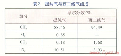 提純氣的調制要求是在滿足l2T天然氣的情況下與西二線氣滿足燃氣互換性的要求。經計算,當提純氣與西二線氣以體積比為11.5摻混時,調制氣高華白數(shù)為47.1MJm3,燃燒勢為37.36,滿足12T天然氣標準。
