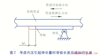 由以上分析計算可知,僅考慮升溫引起的管道熱伸長量與綜合考慮升溫引起的管道熱伸長量以及內(nèi)壓引起的管道伸長量相比,絕對誤差為-112mm,相對誤差為-11.8%。若不考慮內(nèi)壓引起的管道伸長量,易導(dǎo)致滑板長度設(shè)置不合理,從而引起滑板脫離滑托。