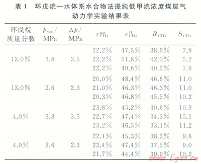 氣體水合物是一種非化學(xué)計(jì)量的結(jié)晶狀固體,客體分子(CH4、C2H6、CO2等)進(jìn)入由水分子形成的“籠”中,水分子通過氫鍵結(jié)合,而客體分子與水分子通過分子力結(jié)合。1m3氣體水合物能儲(chǔ)存標(biāo)準(zhǔn)狀況下150~180m3氣體。近年來,利用水合物方法分離提純低甲烷濃度煤層氣作為一項(xiàng)前沿性研究,受到國內(nèi)外研究者的廣泛關(guān)注[3-6]。與低溫精餾法、變壓吸附法和膜分離法相比,水合物法提純低甲烷濃度煤層氣具有儲(chǔ)氣率高、原料簡單、水合物分解水可循環(huán)利用等優(yōu)點(diǎn)[7-8],但是降低水合物生成的相平衡條件、縮短水合物結(jié)晶時(shí)間、提高CH4分離效率是水合物法分離低甲烷濃度煤層氣需解決的關(guān)鍵科學(xué)問題。熱力學(xué)促進(jìn)劑能有效縮短水合物結(jié)晶誘導(dǎo)時(shí)間,并改善水合物生成條件。趙建忠等[9]研究了十二烷基硫酸鈉(SDS)和四氫呋喃(THF)對水合物法提純低甲烷濃度煤層氣的影響,張保勇等[10-11]研究了SDS和高嶺土對瓦斯氣(39.8%CH4+50.1%N2+10.1%O2)水合過程的影響,并報(bào)道了CH4+N2+O2+THF+H2O體系水合相平衡數(shù)據(jù)。Zhong等人報(bào)道了四丁基溴化銨(TBAB)—水體系水合物法分離低甲烷濃度煤層氣的相平衡數(shù)據(jù)及分離特性,但CH4回收率偏低的問題尚未得到很好解決[4,12]?;谒衔餆崃W(xué)特性,筆者嘗試采用環(huán)戊烷(CP)作為熱力學(xué)促進(jìn)劑,研究低甲烷濃度煤層氣在環(huán)戊烷 水體系形成水合物的相平衡和反應(yīng)動(dòng)力學(xué)特性,得出生長驅(qū)動(dòng)力和環(huán)戊烷濃度對CH4回收率的作用規(guī)律,為水合物法提純低甲烷濃度煤層氣技術(shù)的發(fā)展提供基礎(chǔ)數(shù)據(jù)和實(shí)驗(yàn)依據(jù)。