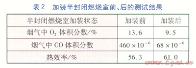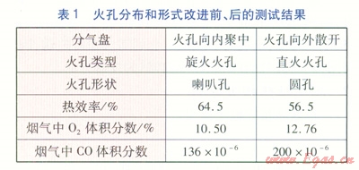 將傳統(tǒng)燃?xì)庠畎凑丈鲜龇椒ㄟM(jìn)行火孔分布和形式的改進(jìn),在鍋支架高度均為30mm、排煙間隙為30mm,未加裝半封閉燃燒室的情況下進(jìn)行測試,改進(jìn)前、后的測試結(jié)果見表1。在表1~4中,CO體積分?jǐn)?shù)是指標(biāo)準(zhǔn)狀態(tài)下、過??諝庀禂?shù)為1時(shí)的折算值。