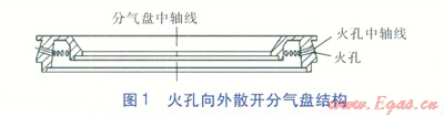 改變原來的火孔向外散開分氣盤結(jié)構(gòu),將分氣盤設(shè)計(jì)成火孔向內(nèi)聚中分氣盤,即火孔分布在分氣盤內(nèi)側(cè)邊緣。在火孔排布時(shí),分氣盤應(yīng)采用上下兩排火孔,兩排火孔的中軸線均與分氣盤的中軸線錯(cuò)開,且火孔中軸線與水平面成一定角度,這樣的火孔稱為旋火火孔。旋火火孔產(chǎn)生的火焰圍繞分氣盤的中軸線呈盤繞狀,比直火火孔(火孔的中軸線與分氣盤的中軸線相交)更能產(chǎn)生渦流形成負(fù)壓,卷入更多的二次空氣,加速燃?xì)馀c二次空氣的再混合,并推動(dòng)高溫?zé)煔饴菪仙?,燃燒更聚中、充分,增?qiáng)了高溫?zé)煔馀c鍋底的熱交換,減少了熱損失,從而提高了熱效率?;鹂紫蛲馍㈤_分氣盤結(jié)構(gòu)見圖1,火孔向內(nèi)聚中分氣盤結(jié)構(gòu)見圖2。