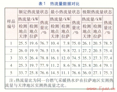 表3列出了5臺樣機分別在拉薩地區(qū)及天津地區(qū)測得的額定熱流量與最小熱流量狀態(tài)的熱效率對比數(shù)據(jù)。