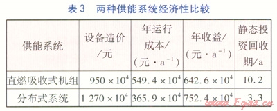 將兩種供能系統(tǒng)部分負(fù)荷運(yùn)行時(shí)間折算成滿負(fù)荷運(yùn)行時(shí)間,設(shè)定供冷期內(nèi)供能系統(tǒng)滿負(fù)荷運(yùn)行時(shí)間為200d,供暖期供能系統(tǒng)滿負(fù)荷運(yùn)行時(shí)間為30d。天然氣價(jià)格按3.79元/m3計(jì)算,電價(jià)按1.00元/(kW·h)計(jì)算,冷熱價(jià)均按100元/GJ計(jì)算。將年耗氣量、耗電量作為年運(yùn)行成本,將年供冷量、供熱量、富裕發(fā)電量作為年收益。兩種供能系統(tǒng)的經(jīng)濟(jì)性比較見表3。由表3可知,在設(shè)定能源價(jià)格下,與直燃吸收式機(jī)組相比,分布式系統(tǒng)的年運(yùn)行成本低,年收益高,靜態(tài)投資回收期僅為3.3a。