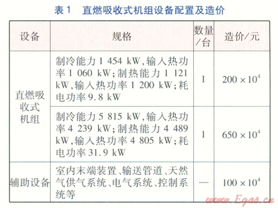 擬采用直燃型吸收機(jī)組、分布式系統(tǒng)分別為商業(yè)建筑供能??紤]到供冷期冷負(fù)荷較高,因此按50%的設(shè)計(jì)冷負(fù)荷(6500kW)作為設(shè)備選型依據(jù)。直燃吸收式機(jī)組、分布式系統(tǒng)設(shè)備配置及造價(jià)分別見表l、2。由表1可知,對于直燃吸收式機(jī)組,供冷期運(yùn)行2臺直燃吸收式機(jī)組(總供冷能力為7269kW),供暖期運(yùn)行供熱能力為1454kW的直燃吸收式機(jī)組,其余冷熱負(fù)荷由輔助電驅(qū)動(dòng)熱泵空調(diào)設(shè)備承擔(dān)。由表2可知,對于分布式系統(tǒng),供冷期運(yùn)行2臺煙氣熱水型吸收式機(jī)組及2臺離心式冷水機(jī)組(總供冷能力為7018kW),供暖期運(yùn)行2臺煙氣熱水型吸收式機(jī)組(總供熱能力為1150kW),其余冷熱負(fù)荷由輔助電驅(qū)動(dòng)熱泵空調(diào)設(shè)備承擔(dān)。