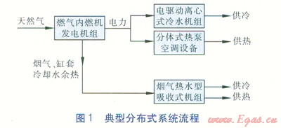 對于典型分布式系統(tǒng)(系統(tǒng)流程見圖1),燃?xì)鈨?nèi)燃機(jī)發(fā)電機(jī)組將天然氣燃燒產(chǎn)生的35%熱能轉(zhuǎn)化為電能,40%的熱能(以煙氣余熱、缸套冷卻水余熱體現(xiàn))利用煙氣熱水型溴化鋰吸收式冷熱水機(jī)組(以下簡稱煙氣熱水型吸收式機(jī)組)進(jìn)行供冷、供熱,剩余25%熱能隨煙氣排空。當(dāng)煙氣熱水型吸收式機(jī)組無法滿足冷熱負(fù)荷時(shí),采用電驅(qū)動(dòng)離心式水冷機(jī)組供冷,分體式熱泵空調(diào)設(shè)備供暖。設(shè)定電能全部用于電驅(qū)動(dòng)空調(diào)設(shè)備制冷及制熱,離心式冷水機(jī)組的制冷系數(shù)取4.5,分體式熱泵空調(diào)的制熱系數(shù)取3.5,則可分別獲得158%的冷能及123%的熱能。設(shè)定煙氣熱水型吸收式機(jī)組的制冷系數(shù)為1.3、制熱系數(shù)為0.95,利用40%的天然氣燃燒熱能,可獲得52%的冷能及38%的熱能。