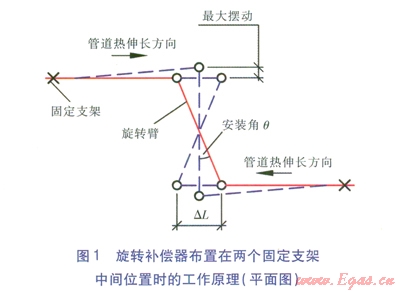 在理論上以及廠家說明書上并沒有限制旋轉(zhuǎn)補(bǔ)償器轉(zhuǎn)角,但實(shí)際上,旋轉(zhuǎn)補(bǔ)償器的轉(zhuǎn)角(安裝角的2倍)不宜過大,應(yīng)限制在40°以內(nèi),否則會(huì)帶來兩個(gè)問題:一是造成管道擺動(dòng)過大,二是易造成補(bǔ)償器轉(zhuǎn)角過大導(dǎo)致泄漏。旋轉(zhuǎn)補(bǔ)償器布置在兩個(gè)固定支架中間位置時(shí)的工作原理見圖l。為補(bǔ)償管道的熱伸長量,又不使得旋轉(zhuǎn)補(bǔ)償器出現(xiàn)較大的轉(zhuǎn)角和擺動(dòng),需限定旋轉(zhuǎn)臂最小長度及最佳安裝角。
