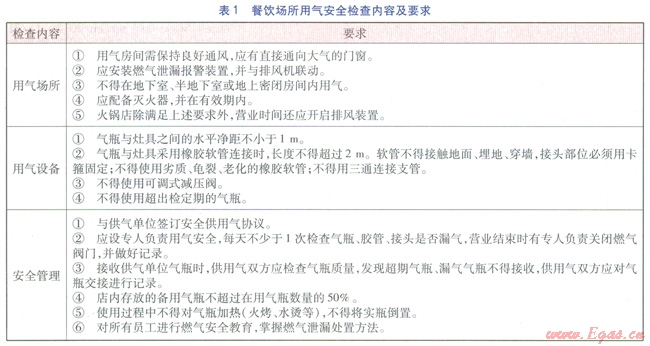 自2012年11月山西壽陽(yáng)火鍋店發(fā)生燃?xì)獗ㄊ鹿屎?,武漢市立即開(kāi)展對(duì)餐飲場(chǎng)所的用氣安全檢查。按武漢市出臺(tái)的《商用燃?xì)庠罹咴O(shè)施安裝及驗(yàn)收技術(shù)規(guī)程》(以下簡(jiǎn)稱(chēng)《規(guī)程》)的規(guī)定,使用管道氣的餐飲場(chǎng)所在通氣前須進(jìn)行驗(yàn)收,且管道氣供氣單位須定期上門(mén)對(duì)用氣場(chǎng)所進(jìn)行安全檢查。因此,此次用氣安全檢查的重點(diǎn)是使用瓶裝氣的餐飲場(chǎng)所。根據(jù)GB 50028—2006《城鎮(zhèn)燃?xì)庠O(shè)計(jì)規(guī)范》、CJJ 94—2009《城鎮(zhèn)燃?xì)馐覂?nèi)工程施工與質(zhì)量驗(yàn)收規(guī)范》、《規(guī)程》等對(duì)瓶裝氣用氣場(chǎng)所提出的安全要求,制定了餐飲場(chǎng)所用氣安全檢查的內(nèi)容及要求(見(jiàn)表l)。