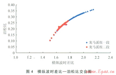 整體龍馬溪組楊氏模量介于l×104~3.5×104MPa,平均為2.3×104MPa;泊松比介于0.1~0.37,平均為0.24。通過(guò)圖3可以看出,龍馬溪組一段楊氏模量平均值為1.4×104MPa,泊松比平均值為0.3;龍馬溪組二段楊氏模量平均值為l.8×104MPa,泊松比平均值為0.23。龍馬溪組二段較龍馬溪組一段具有低泊松比,高楊氏模量,說(shuō)明其脆性?xún)?yōu)于一段。圖4為橫縱波時(shí)差比和泊松比的交會(huì)圖,可以看出龍馬溪組二段的橫縱波時(shí)差比明顯低于一段,說(shuō)明低橫縱波時(shí)差比參數(shù)用于表征頁(yè)巖的脆性程度是有效的。