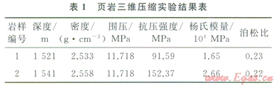 通過(guò)巖石力學(xué)實(shí)驗(yàn),龍馬溪組二段頁(yè)巖儲(chǔ)層基質(zhì)巖石,抗壓強(qiáng)度分布在91~152MPa,平均抗壓強(qiáng)度為121.98MPa,平均楊氏模量為2.15×104MPa,平均泊松比為0.23(表1)。測(cè)試數(shù)據(jù)分析結(jié)果可知,巖樣2對(duì)比巖樣l具有低泊松比和高楊氏模量的特征,說(shuō)明龍馬溪組二段在深度1541m時(shí),頁(yè)巖脆性程度最優(yōu),與先前的礦物分析和脆性指數(shù)得到的結(jié)論相符。