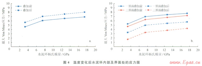 由圖4-a圖看出,水泥環(huán)內(nèi)的最大Von Miscs應(yīng)力隨水泥環(huán)楊氏模量的增大而增大;與初始應(yīng)力替加后,Von Mises應(yīng)力增大為4.4~8.0MPa,小于普通水泥環(huán)的屈服強(qiáng)度。所以,當(dāng)溫度變化幅度不大時,水泥環(huán)通常不會發(fā)生屈服破壞,但溫度升高幅度較大時水泥環(huán)可能會發(fā)生屈服破壞。因此,對熱采井等應(yīng)避免使用膨脹水泥漿,且應(yīng)使用低楊氏模量的水泥環(huán)。由圖4-b可以看出,與初始應(yīng)力疊加前,一、二界面在徑向上受拉伸應(yīng)力的作用且應(yīng)力隨水泥環(huán)的楊氏模量增大而增大,為4.4~8.0MPa,遠(yuǎn)大于一、二界面膠結(jié)的抗拉強(qiáng)度,會破壞一、二界面膠結(jié);與初始應(yīng)力疊加后,徑向應(yīng)力顯著降低至1.4~6.0MPa,降低了一、二界面膠結(jié)破壞的風(fēng)險。因此,通過降低水泥環(huán)楊氏模量和增大初始應(yīng)力都可以降低界面膠結(jié)破壞的風(fēng)險,建議采用較低楊氏模量的水泥環(huán)或使用膨脹水泥來預(yù)防失效。