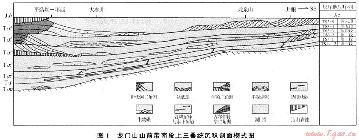 據(jù)陳洪德的研究[5],須二段內(nèi)逐漸出現(xiàn)了過渡再旋回和巖屑再旋回。這說明龍門山從須二段開始了逆沖推覆,于龍門山地區(qū)形成以逆沖推覆作用為主的造山帶雛形,因而劃為構(gòu)造層序二。部分隆升幅度較大的地區(qū)開始露出海面并構(gòu)成北東向展布的島鏈,島鏈以西為大面積收縮的多島殘余海盆,島鏈以東則為以擠壓坳陷沉降為主的川西前陸盆地,即真正意義上的川西前陸盆地已具雛形。形成了巨厚的自西向東減薄的三角洲砂體,歸納沉積剖面模式見圖1。